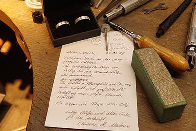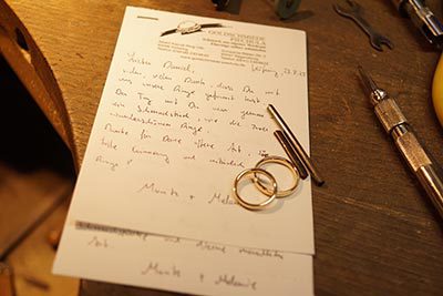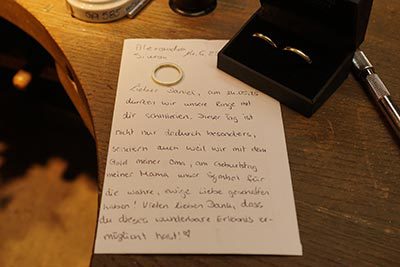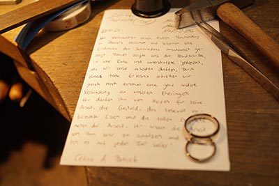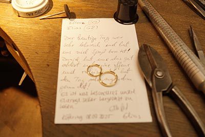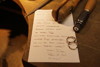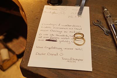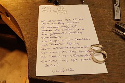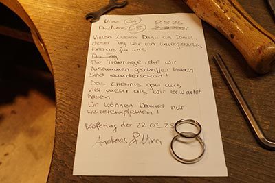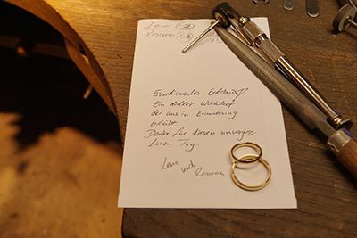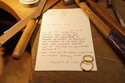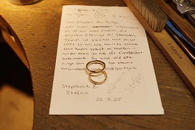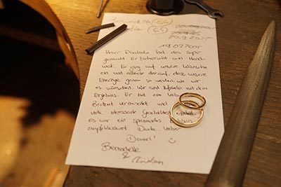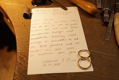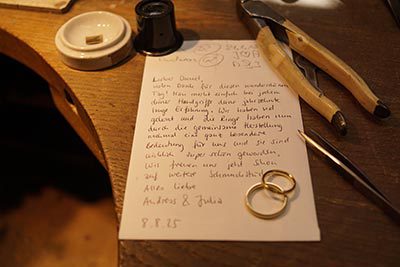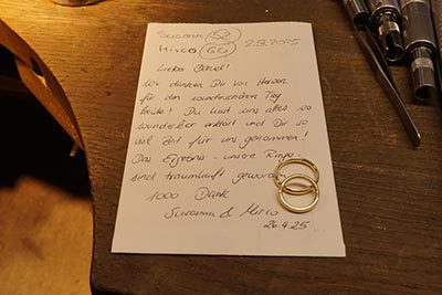 vielen Dank für diesen wunderschönen Tag! Man merkt einfach bei jedem deiner Handgriffe deine jahrzehnte lange Erfahrung. Wir haben viel gelernt und die Ringe haben nun durch die gemeinsame Herstellung nochmal eine ganz besondere Bedeutung für uns und sie sind wirklich super schön geworden. Wir freuen uns jetzt schon auf weitere Schmuckstücke. Alles liebe