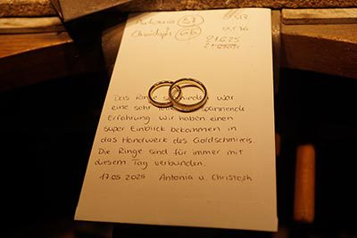 Das Ringe schmieden war eine sehr tolle und spannende Erfahrung. Wir haben einen super Einblick bekommen in das Handwerk des Goldschmieds. Die Ringe sind für immer mit diesem Tag verbunden.